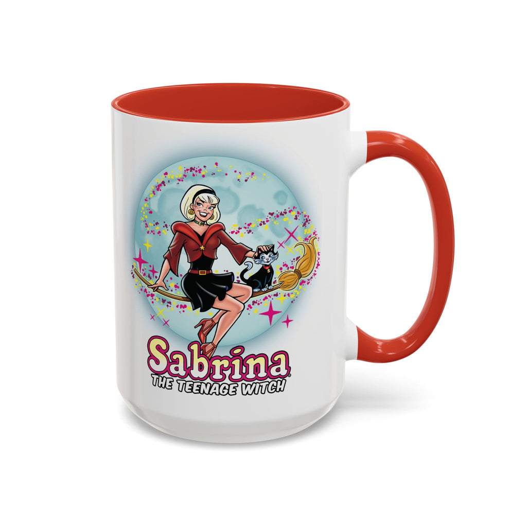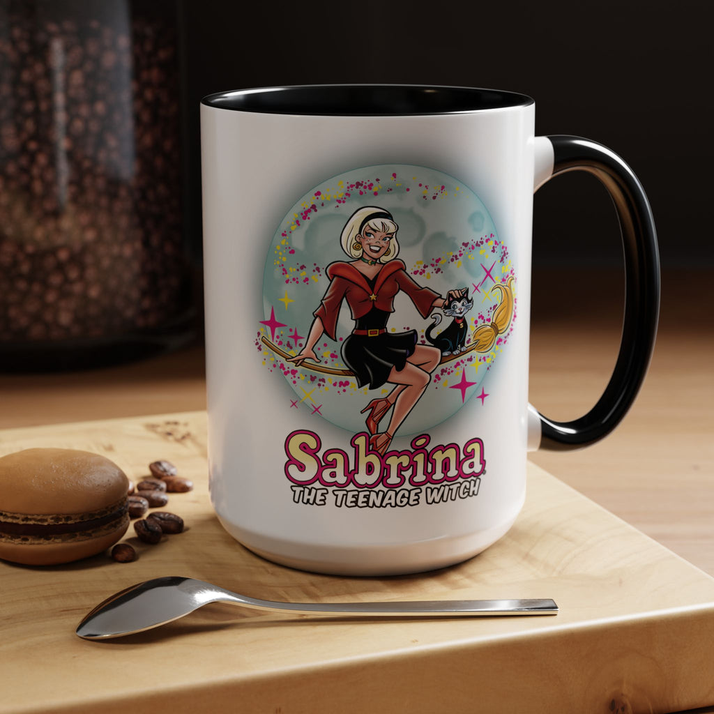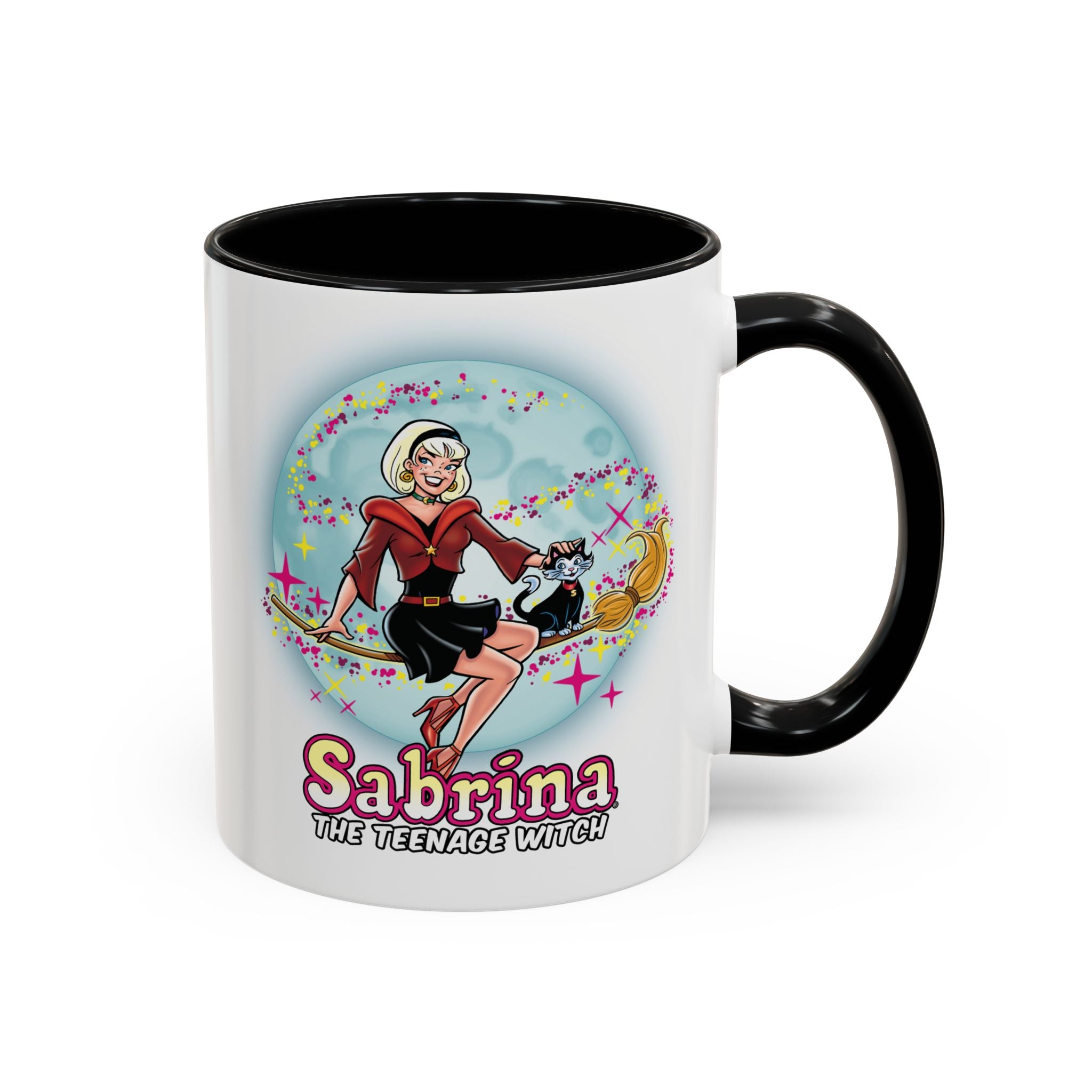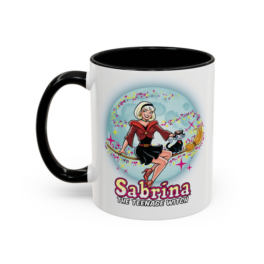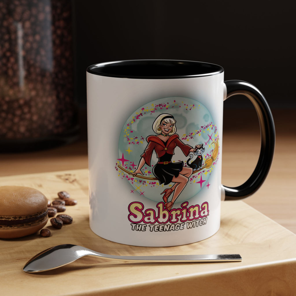 This mug features a modern take on the classic Sabrina the Teenage Witch on a broom with Salem. Add some color to your routine with this two-tone, custom accent coffee mug. Featuring an accented C-Handle that is comfortable to use, as well as an accented interior to add more contrast and character.