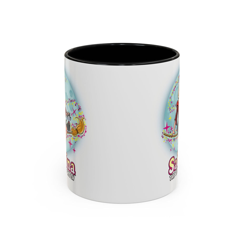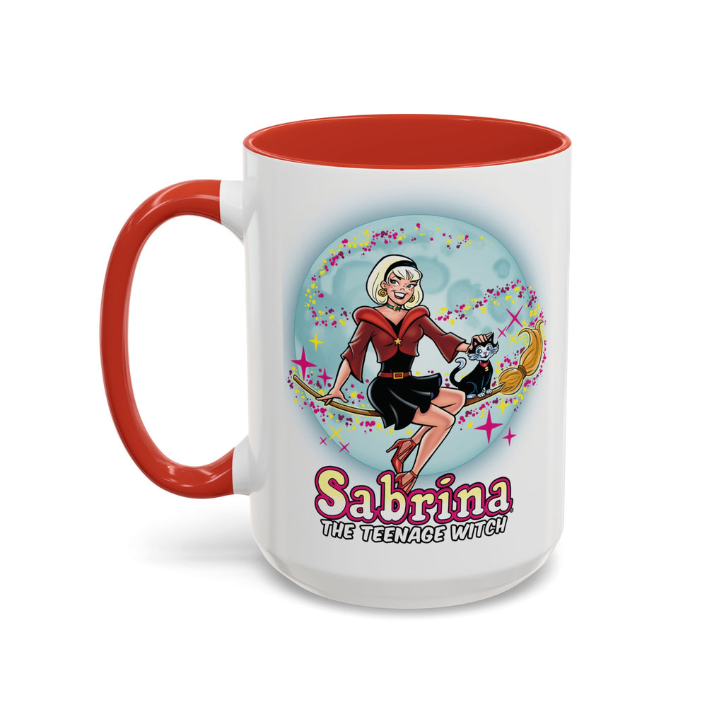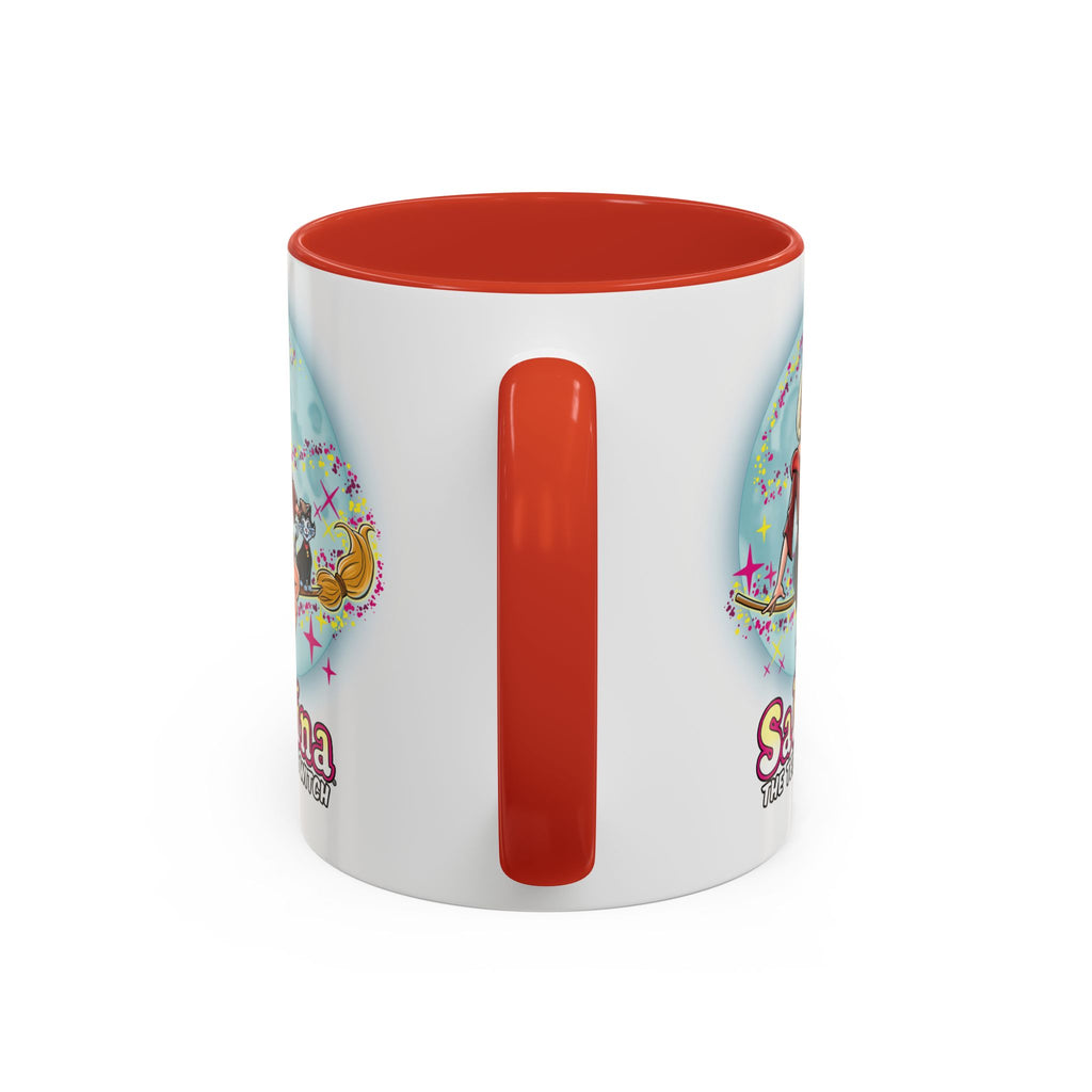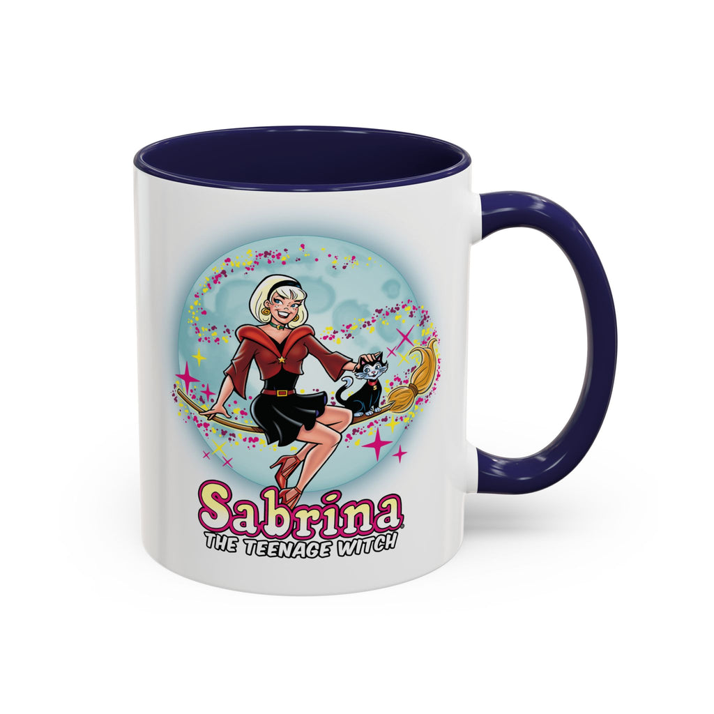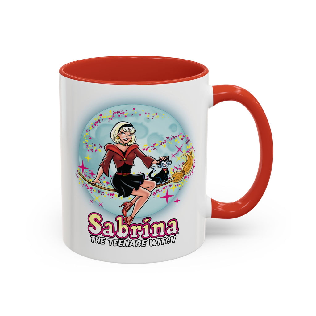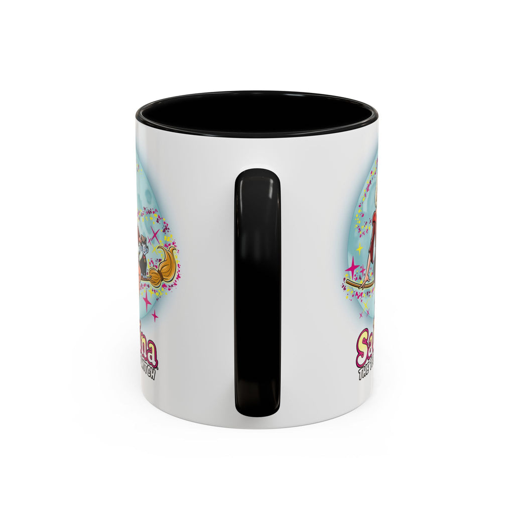 This mug features a modern take on the classic Sabrina the Teenage Witch on a broom with Salem. Add some color to your routine with this two-tone, custom accent coffee mug. Featuring an accented C-Handle that is comfortable to use, as well as an accented interior to add more contrast and character.
