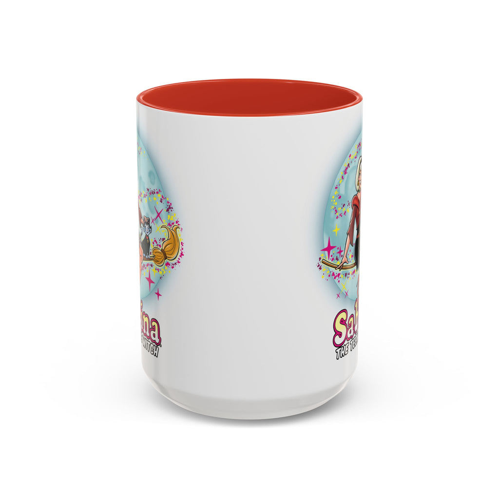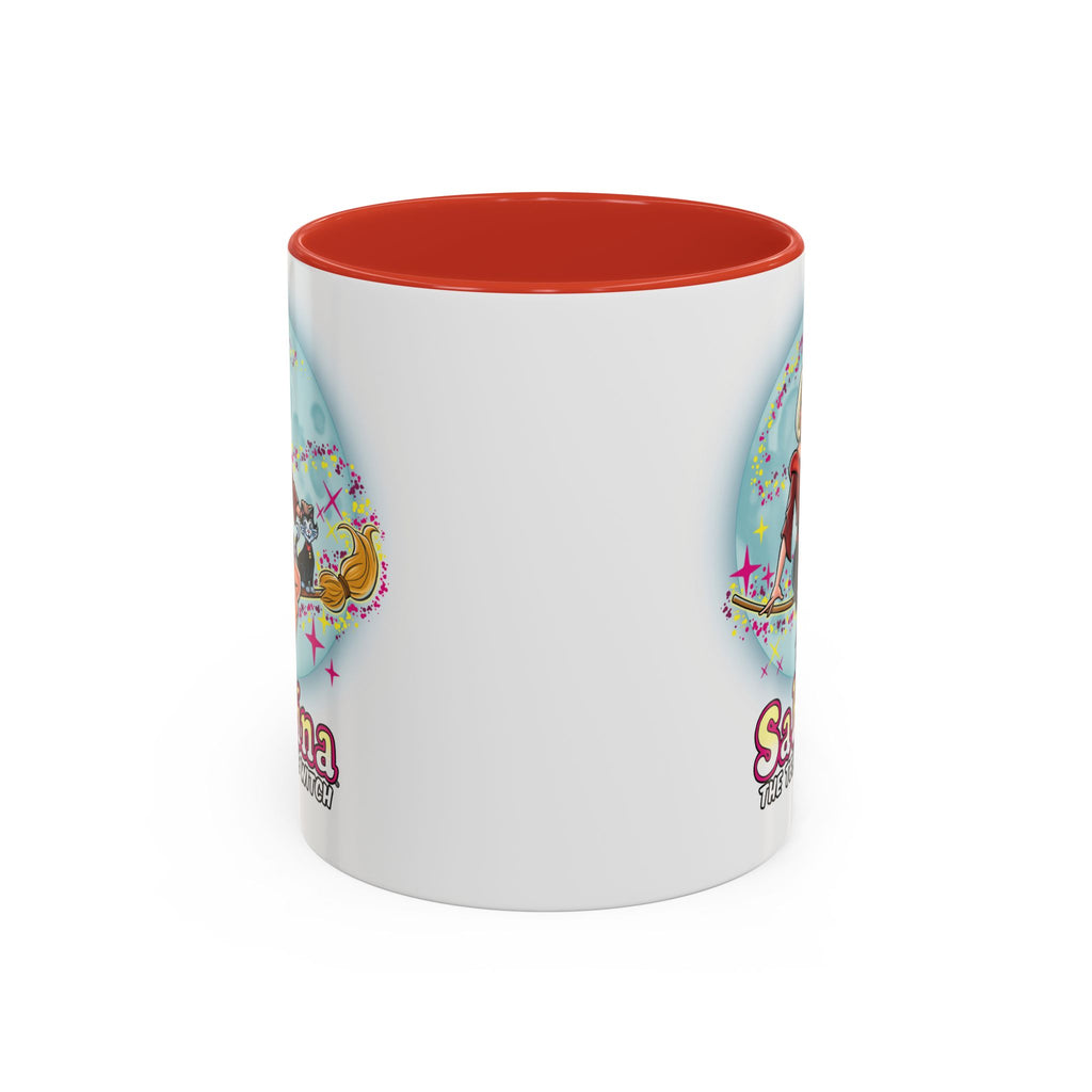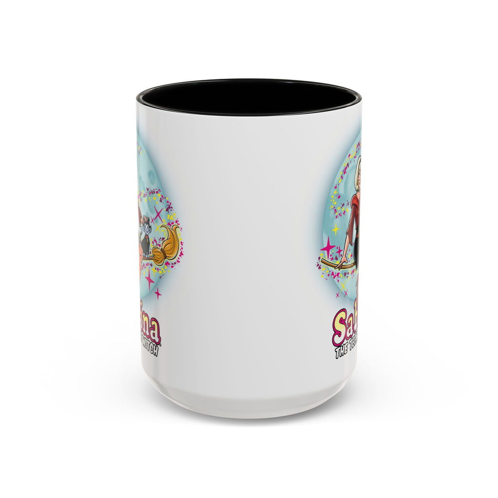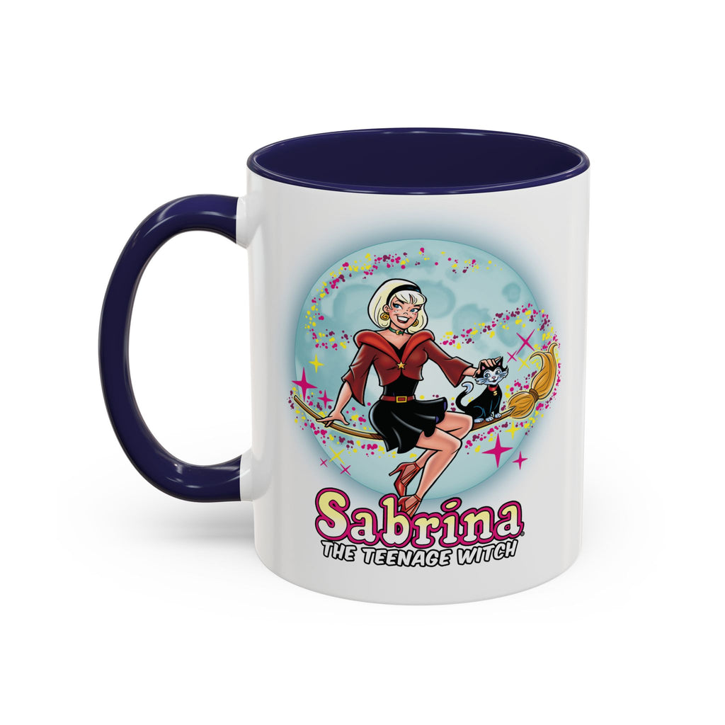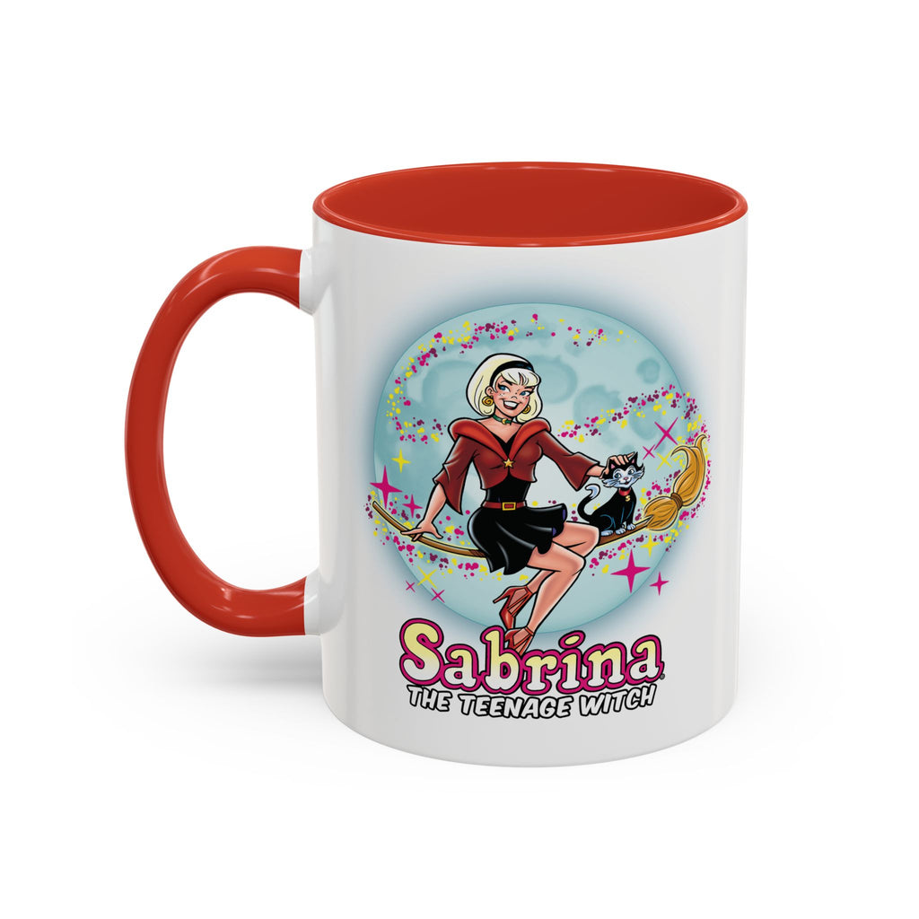 This mug features a modern take on the classic Sabrina the Teenage Witch on a broom with Salem. Add some color to your routine with this two-tone, custom accent coffee mug. Featuring an accented C-Handle that is comfortable to use, as well as an accented interior to add more contrast and character.