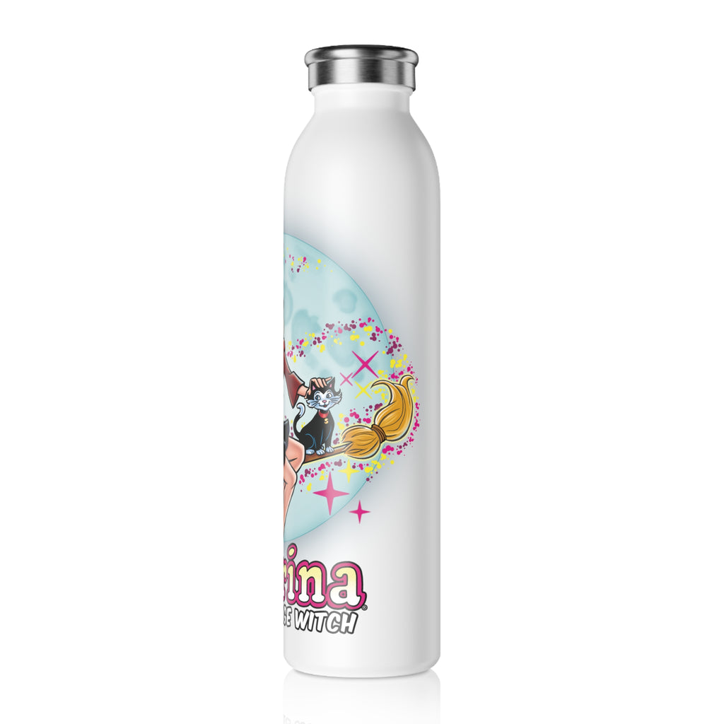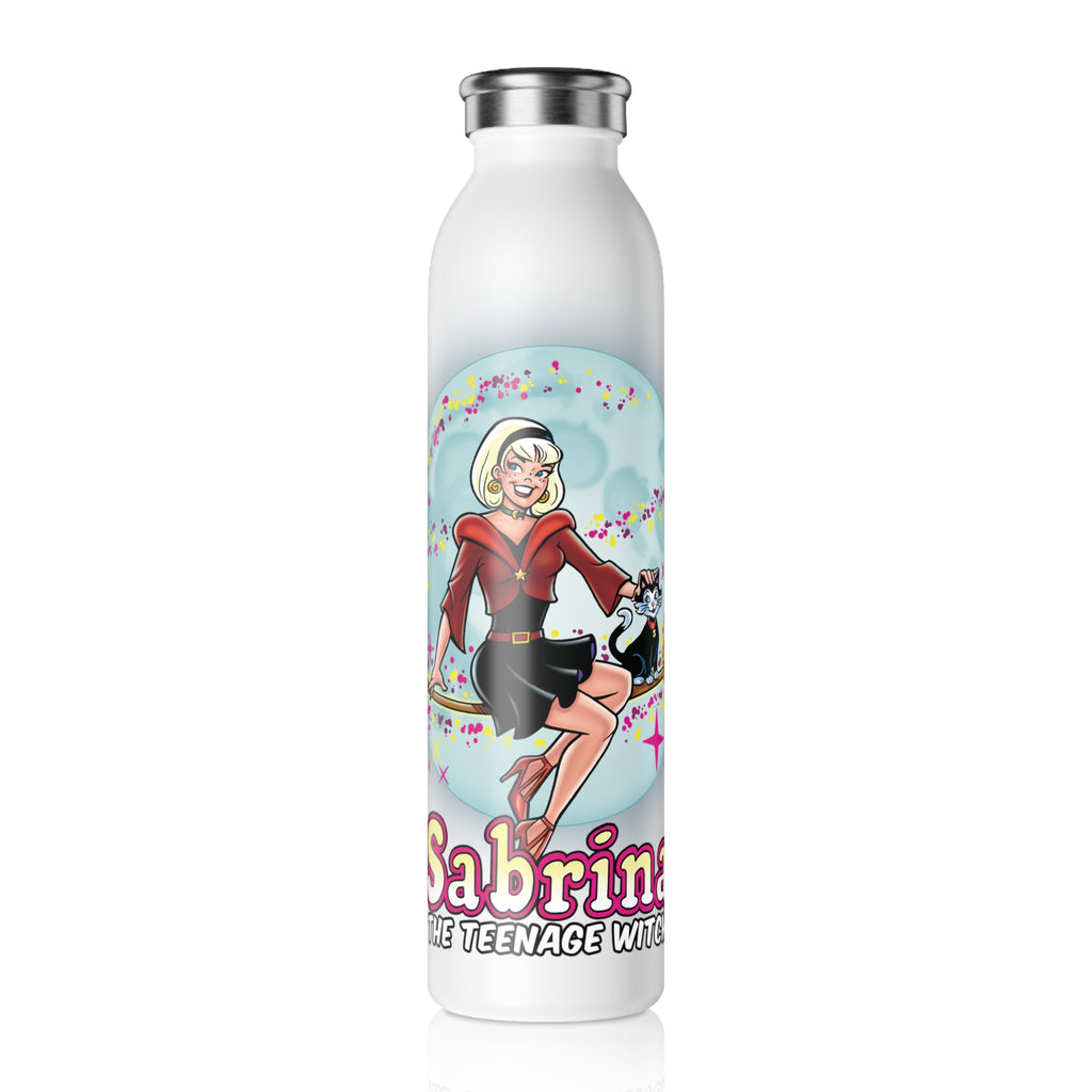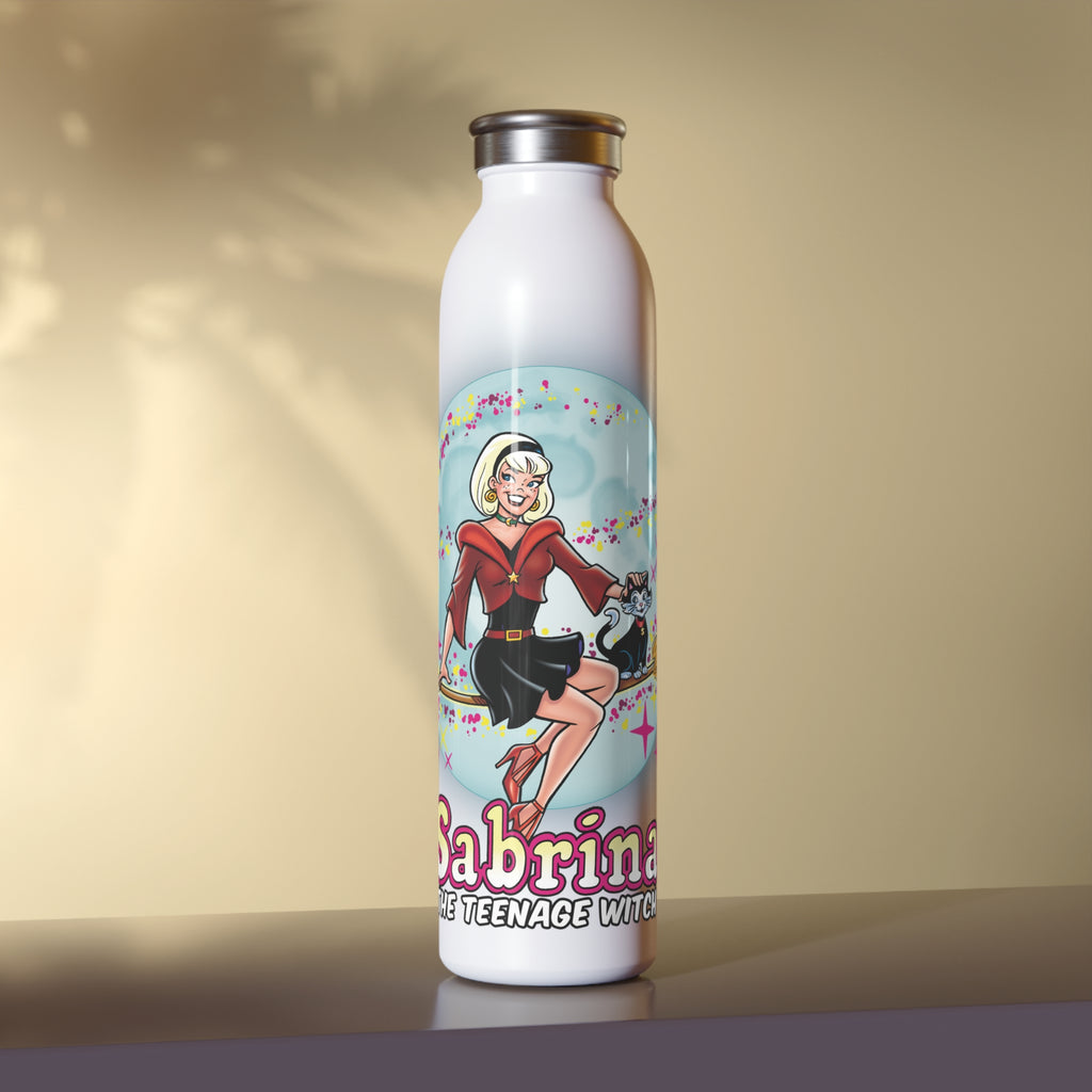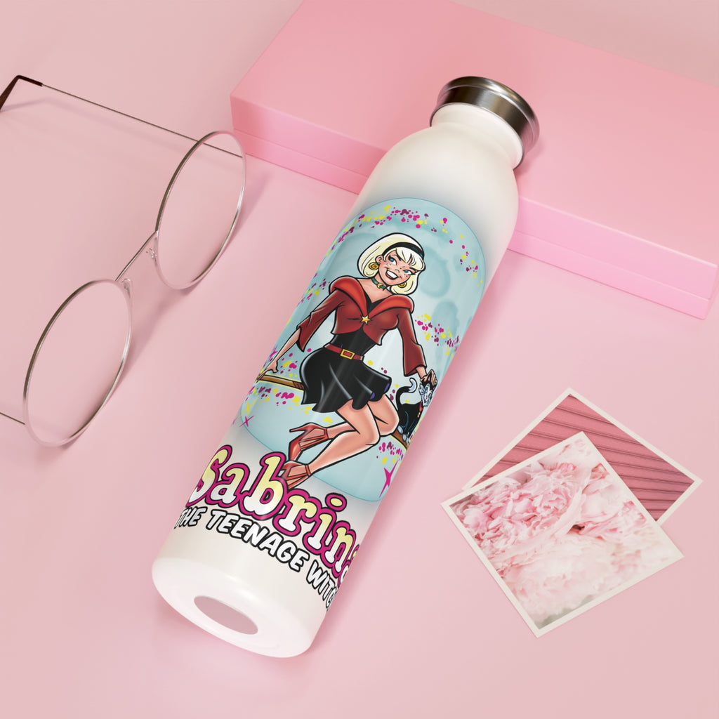 Sabrina The Teenage Witch on Broom Modern Design Stainless Steal 20oz water bottle features a modern take on the classic Sabrina the Teenage Witch on a broom with Salem.