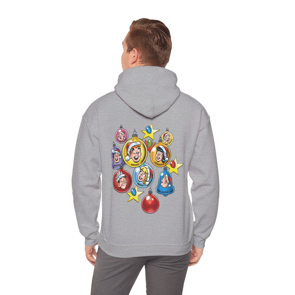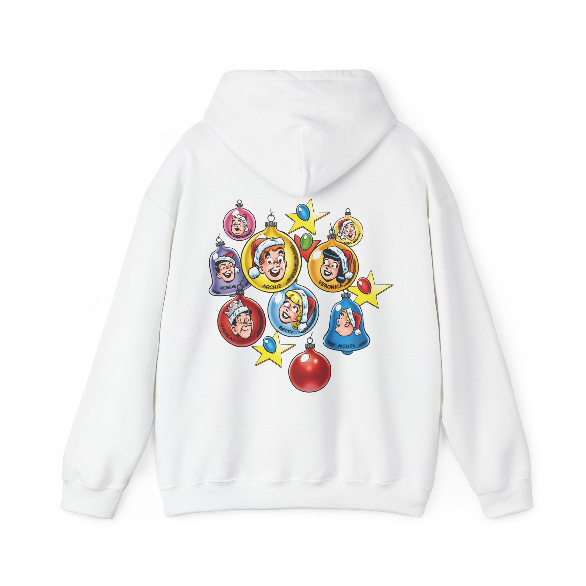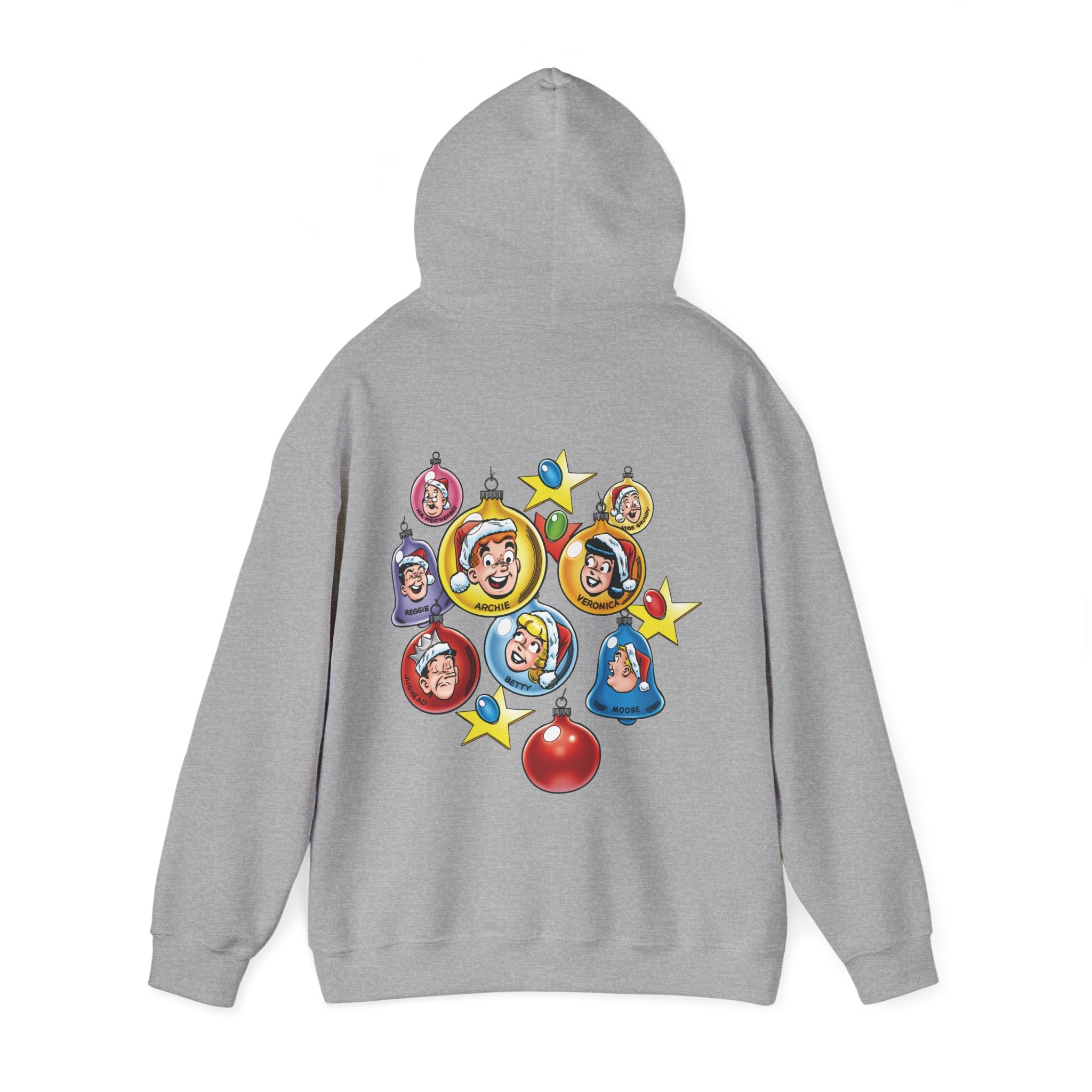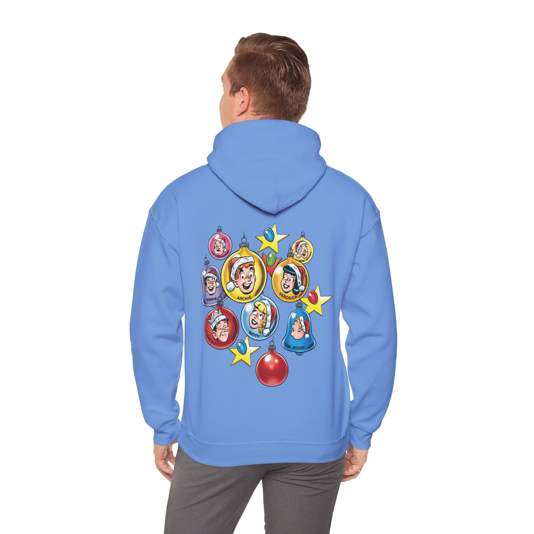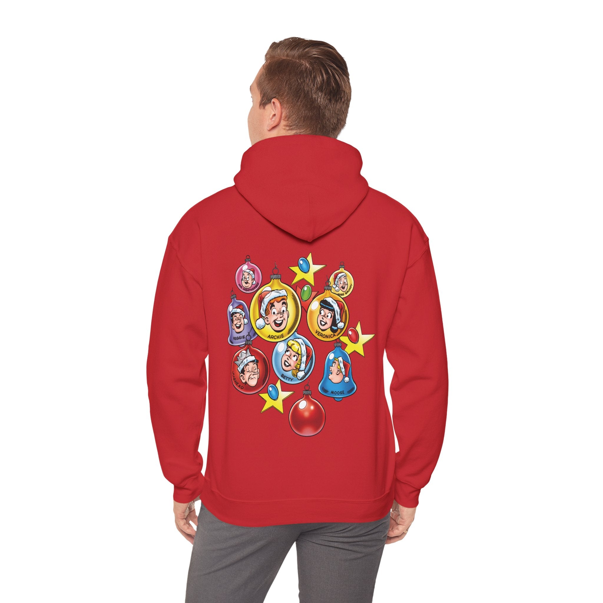 Archie Christmas Ornaments Design Unisex Heavy Blend™ Hooded Sweatshirt features printing on the front and back. On the front is the Archie Holiday Logo and the back is a collection of Archie Comics Ornaments.