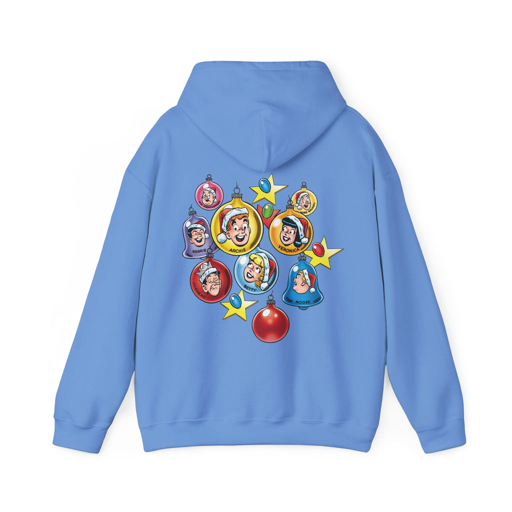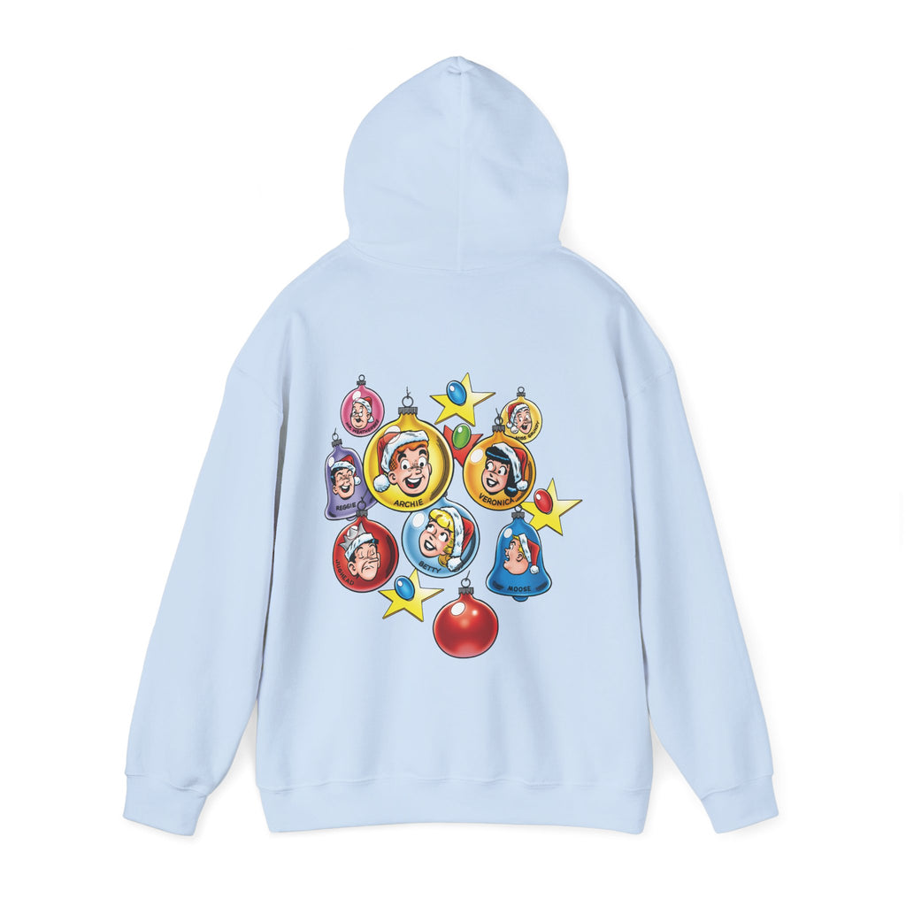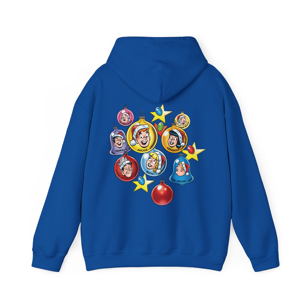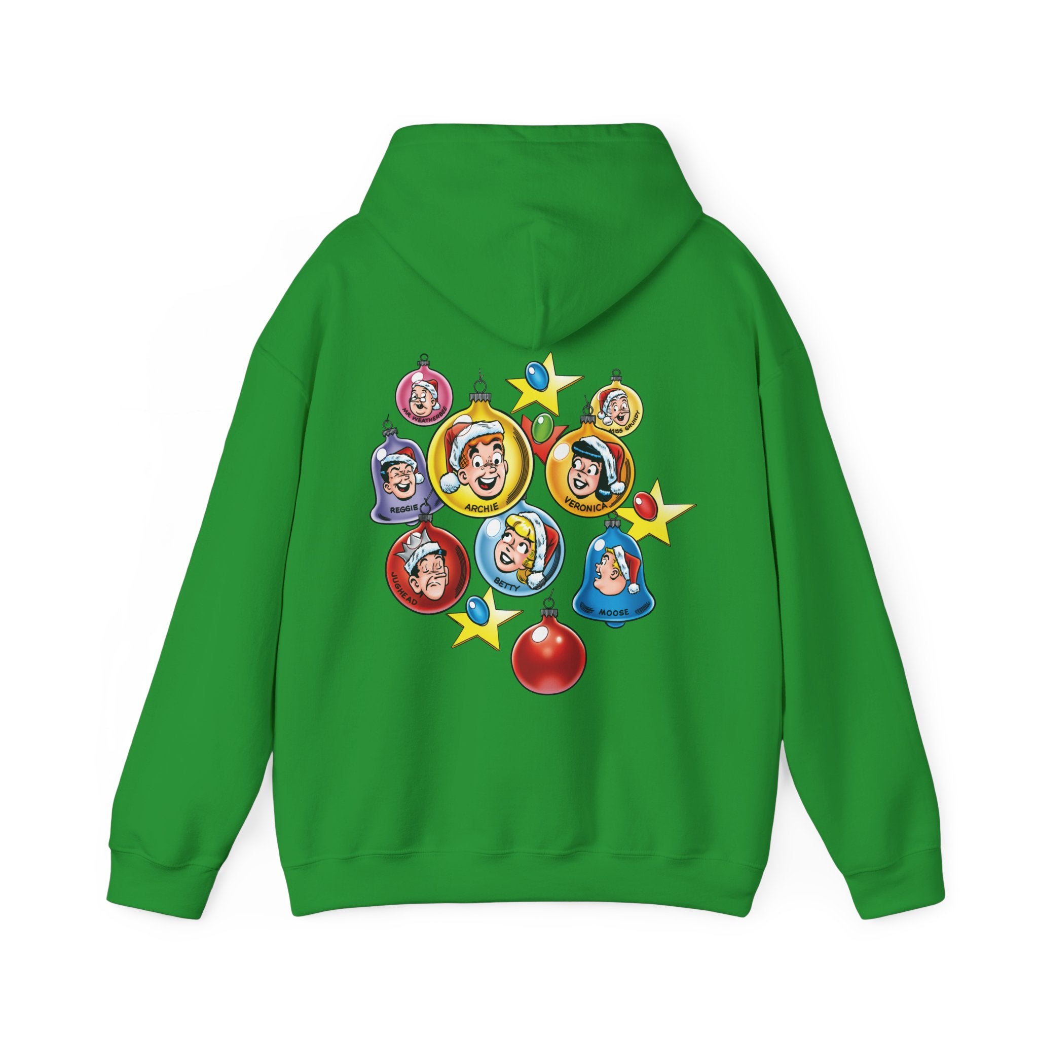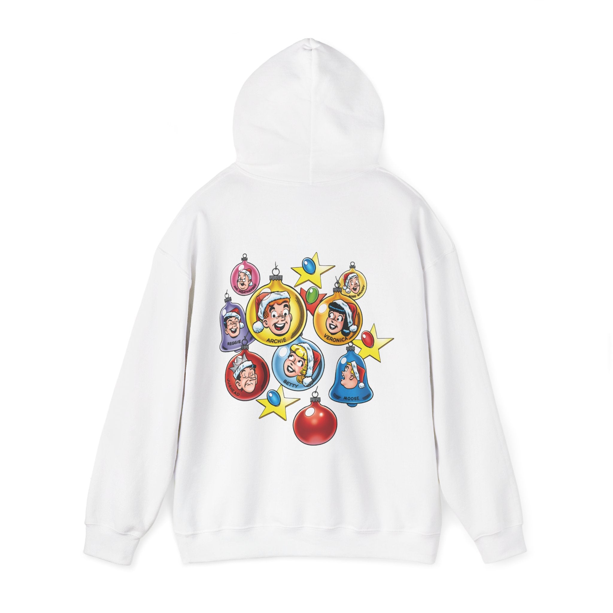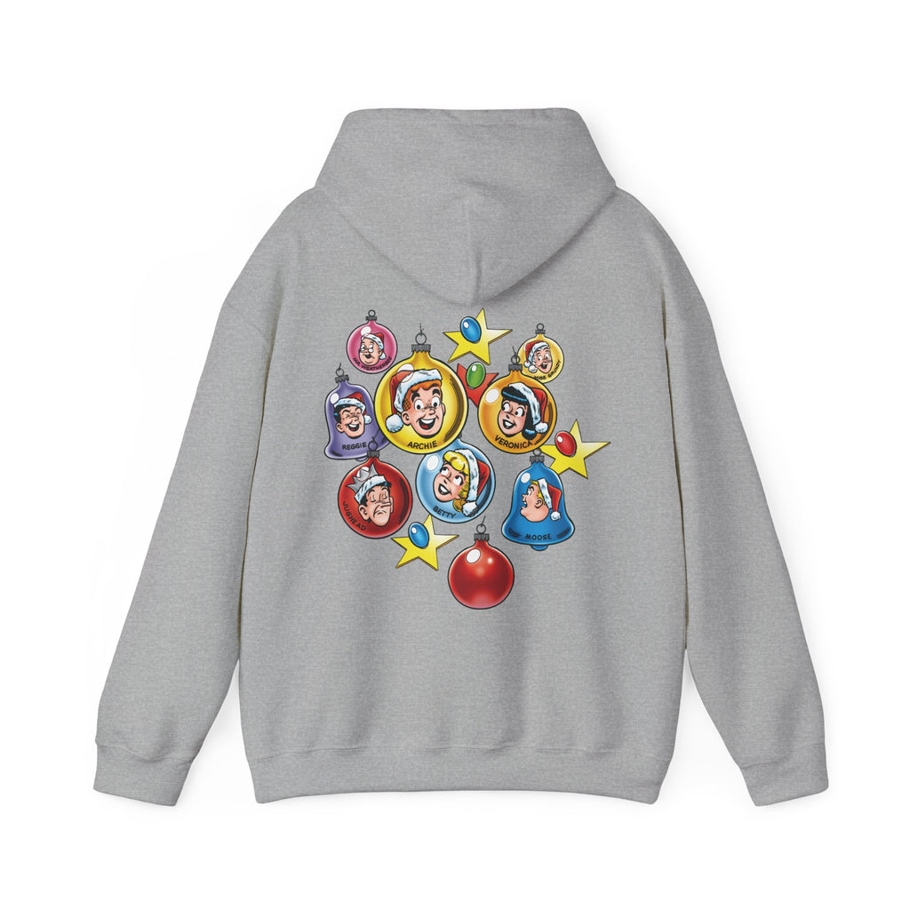 Archie Christmas Ornaments Design Unisex Heavy Blend™ Hooded Sweatshirt features printing on the front and back. On the front is the Archie Holiday Logo and the back is a collection of Archie Comics Ornaments.