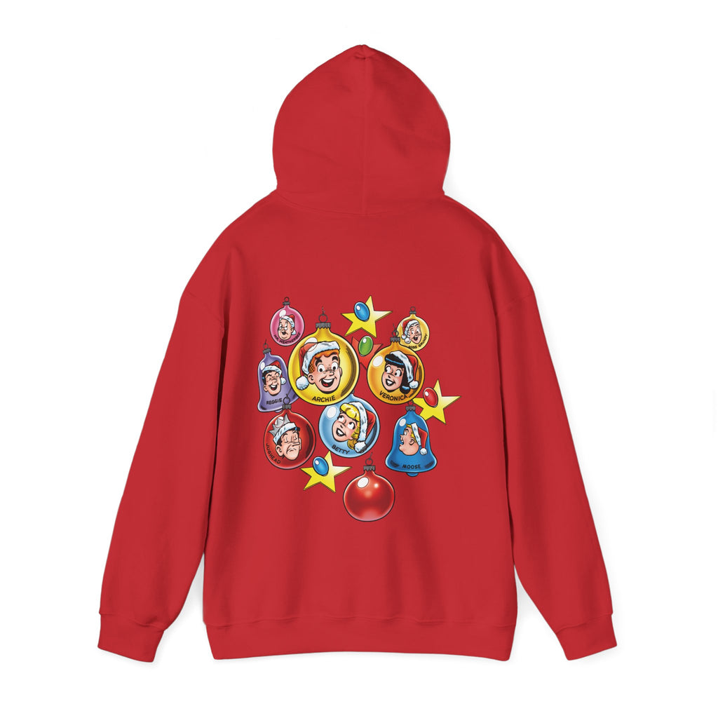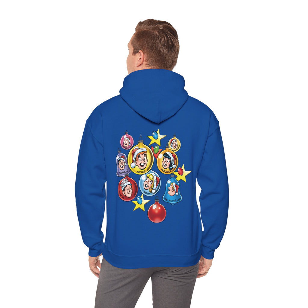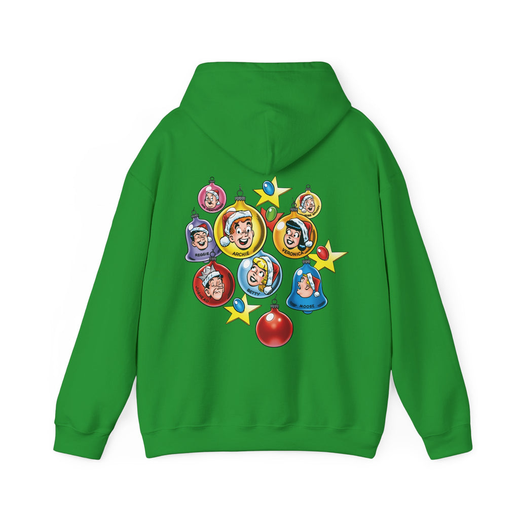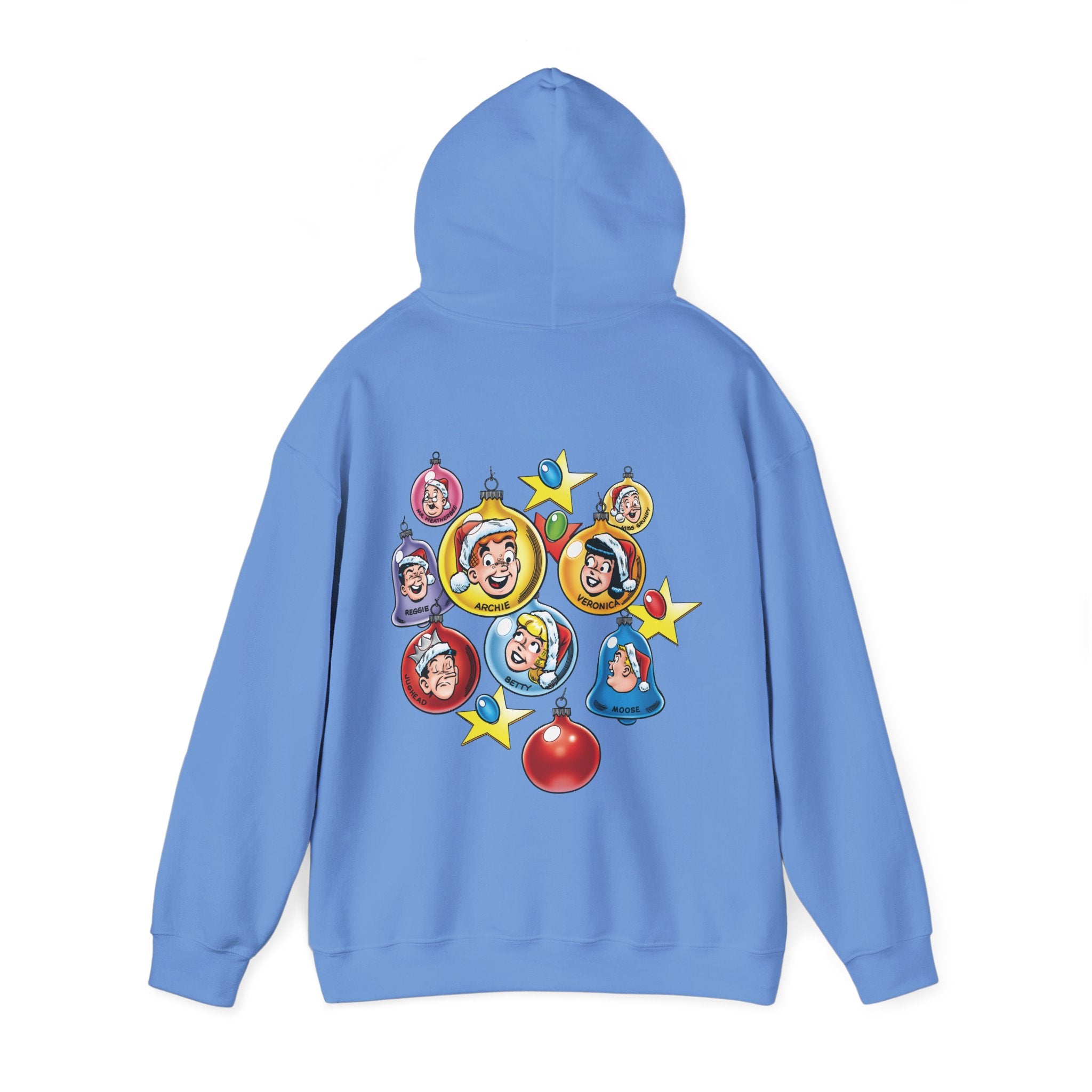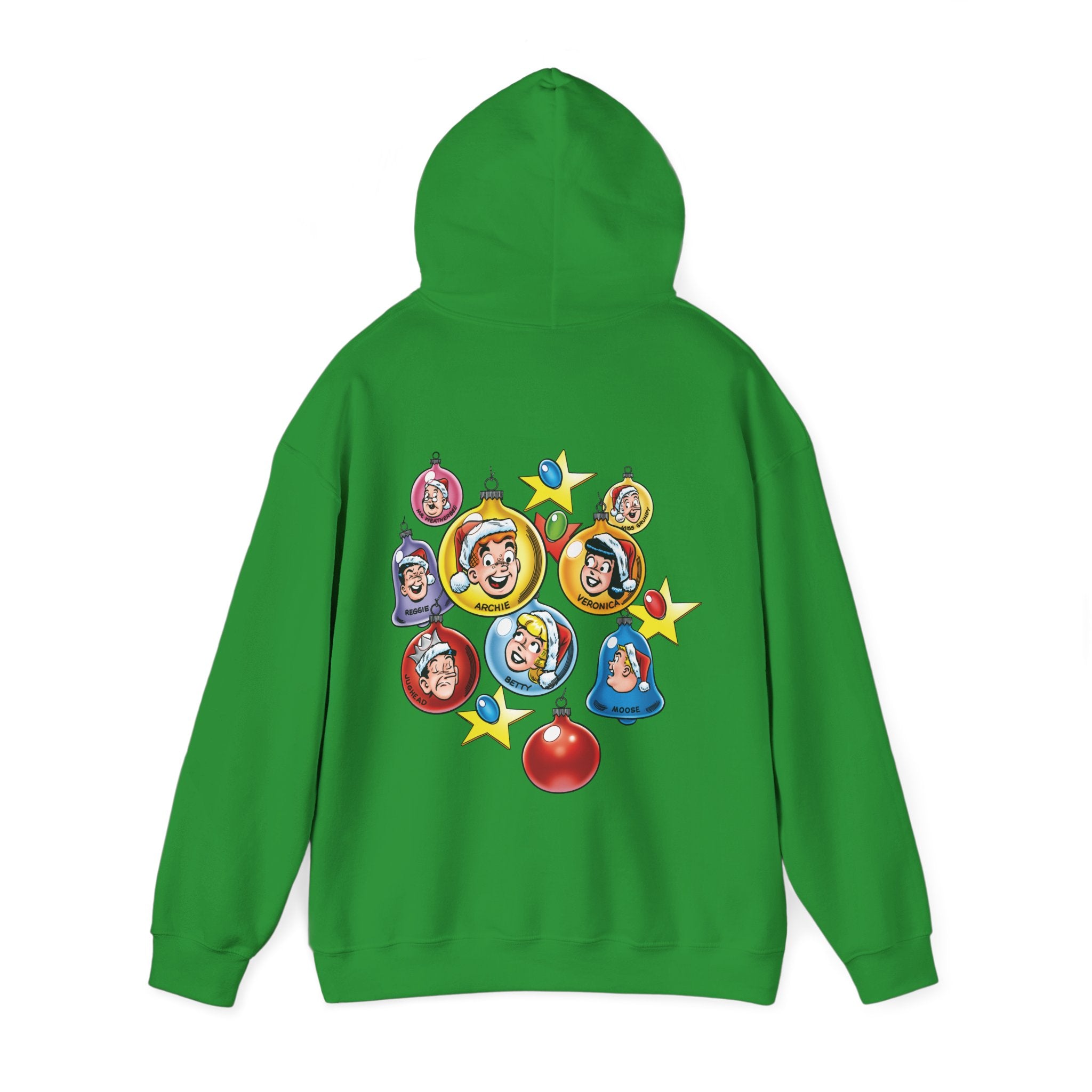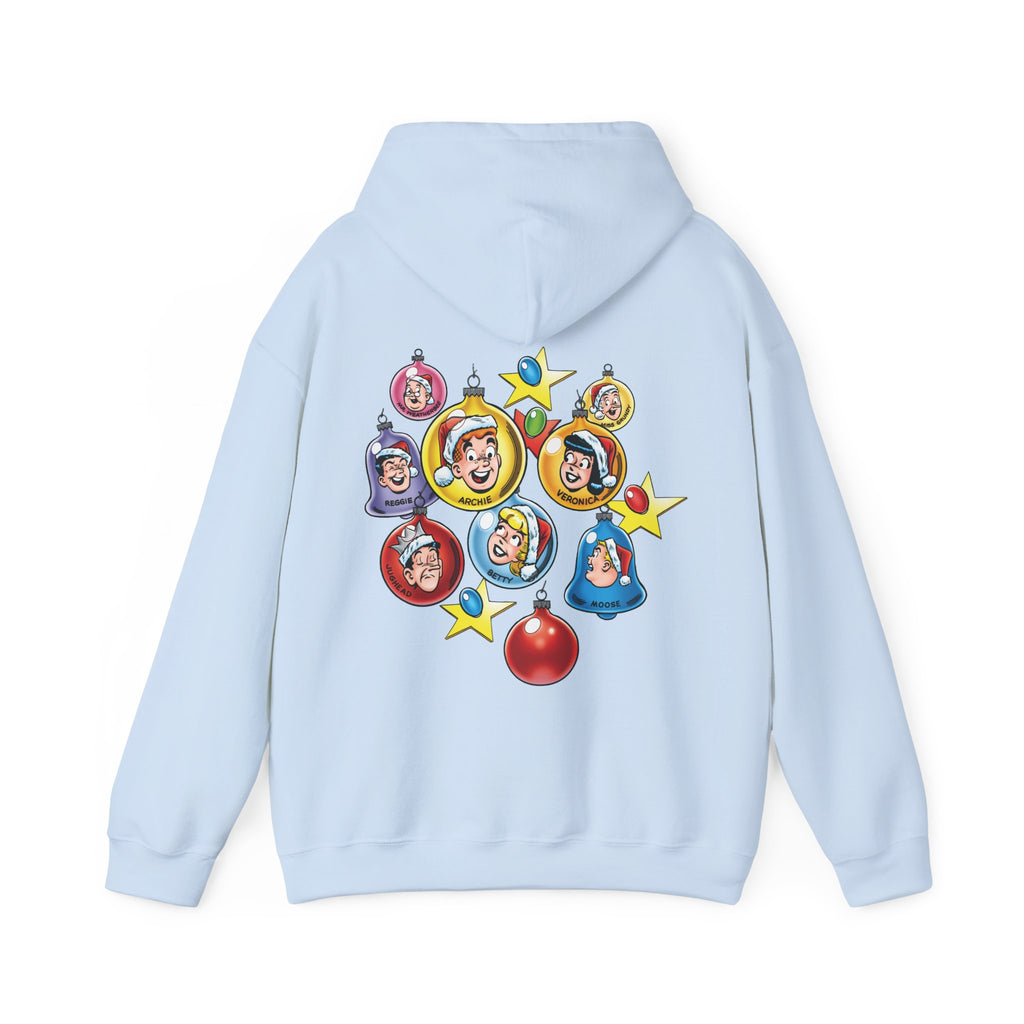Archie Christmas Ornaments Design Unisex Heavy Blend™ Hooded Sweatshirt features printing on the front and back. On the front is the Archie Holiday Logo and the back is a collection of Archie Comics Ornaments.