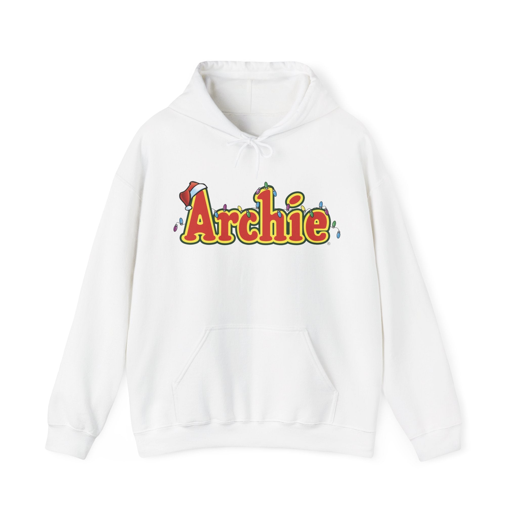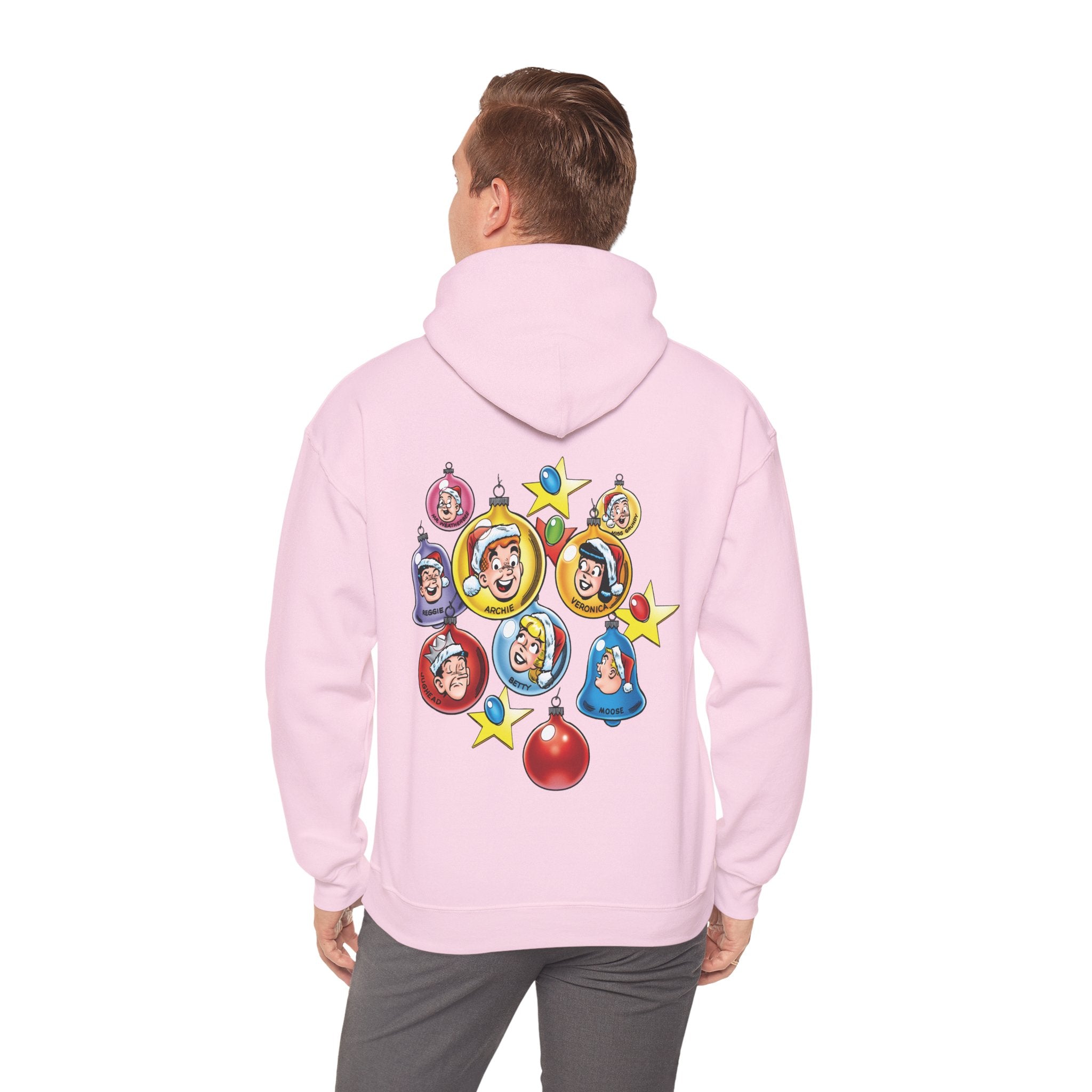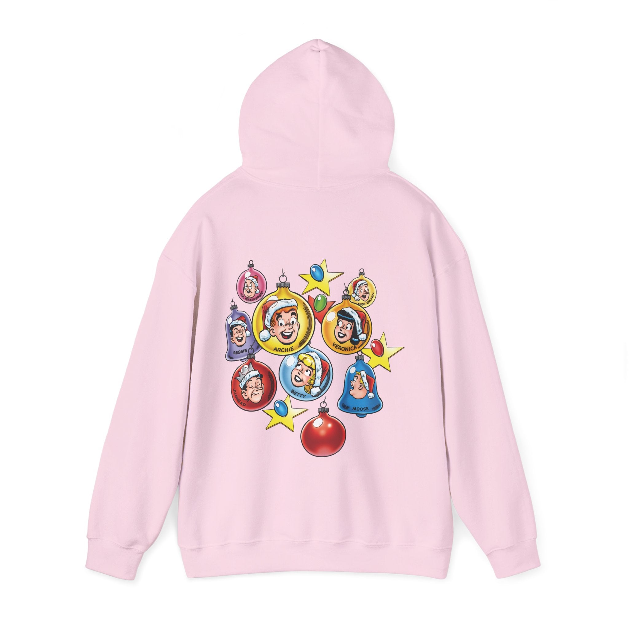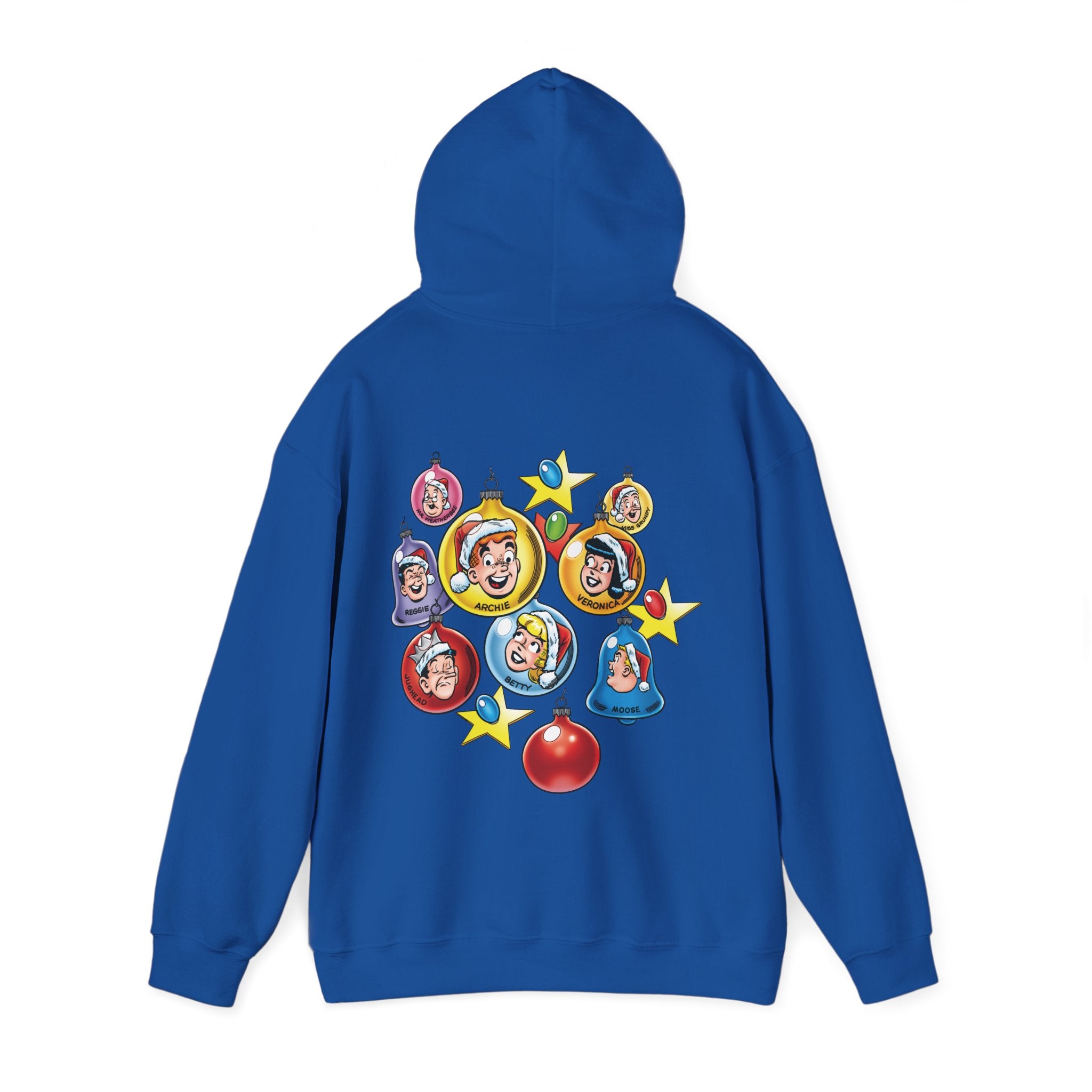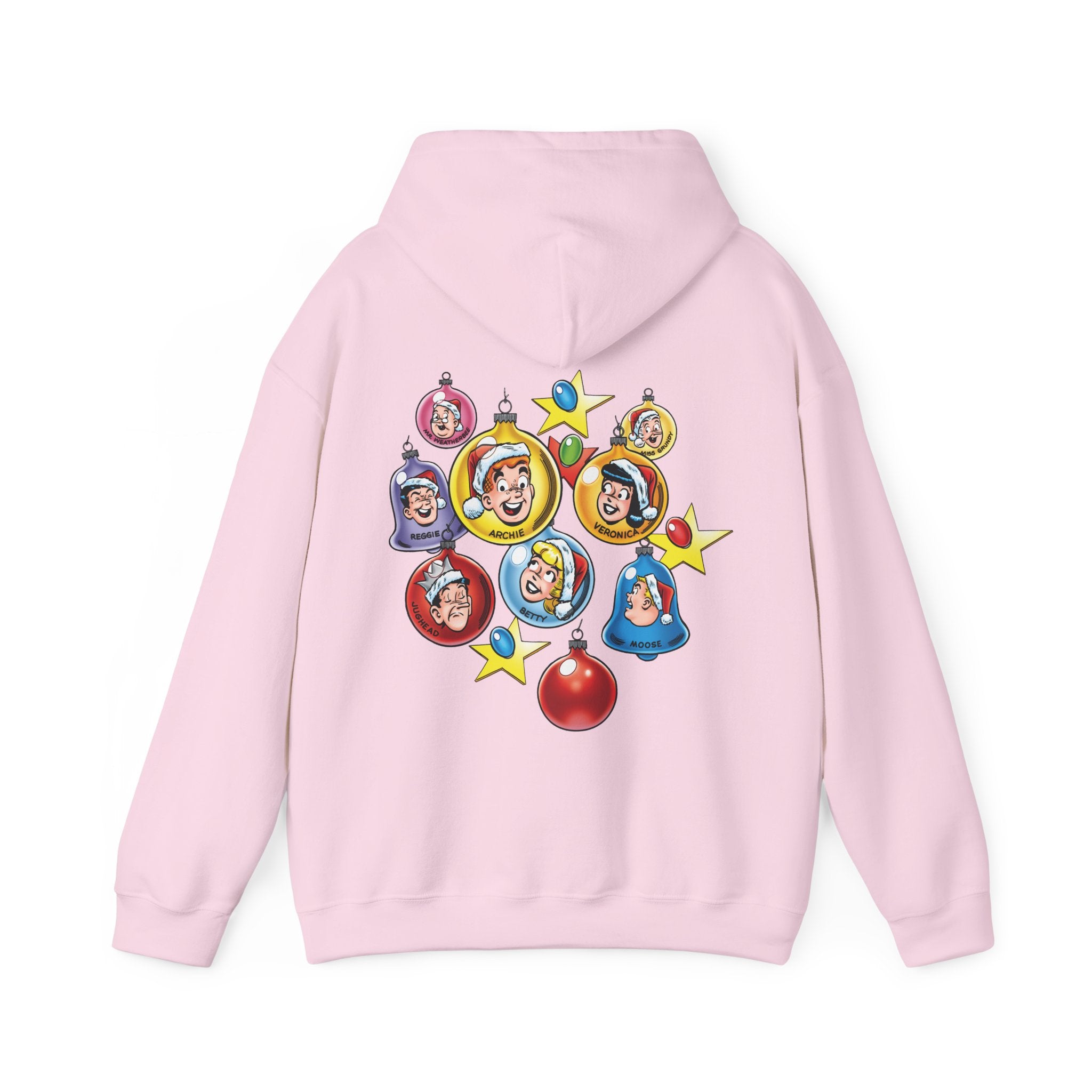 Archie Christmas Ornaments Design Unisex Heavy Blend™ Hooded Sweatshirt features printing on the front and back. On the front is the Archie Holiday Logo and the back is a collection of Archie Comics Ornaments.