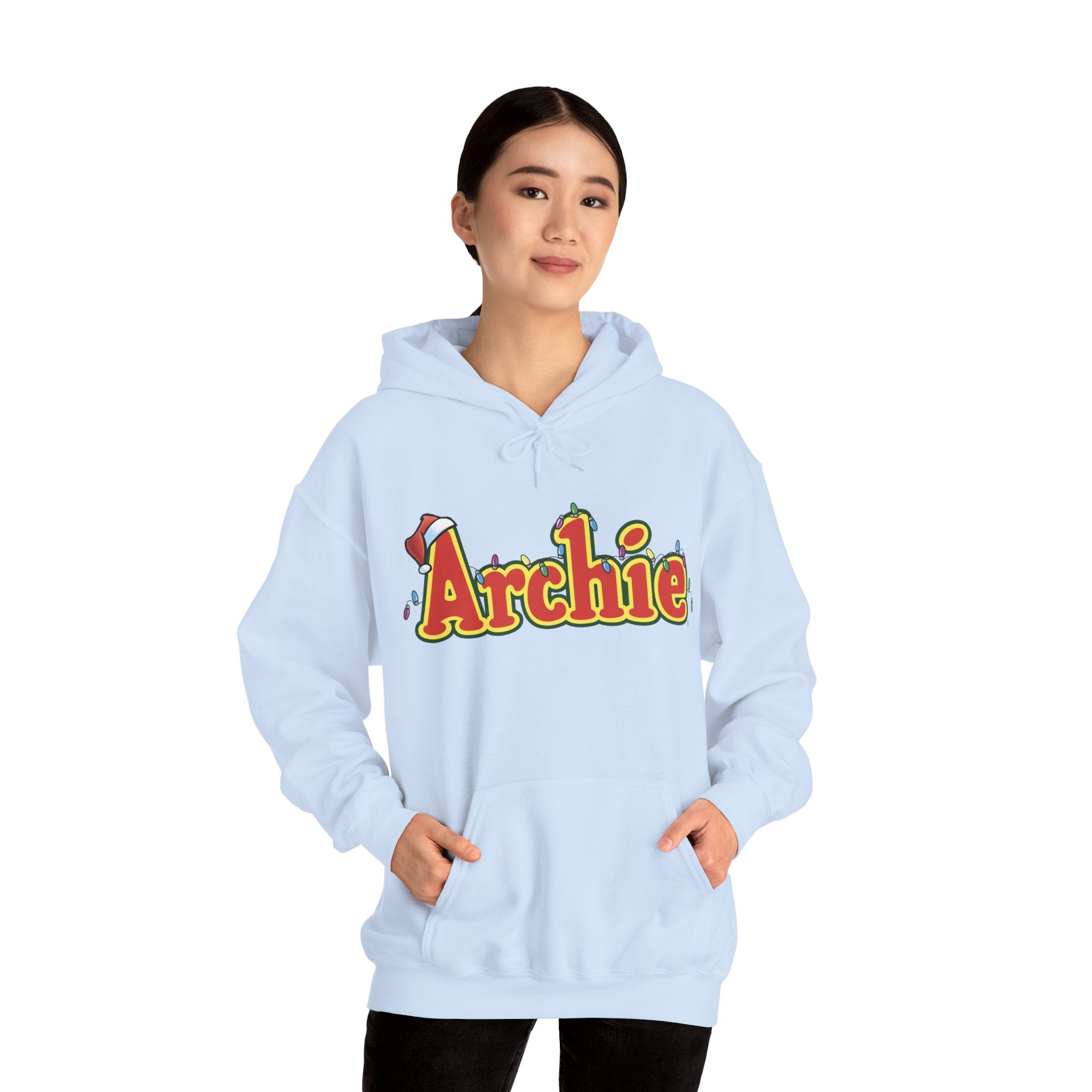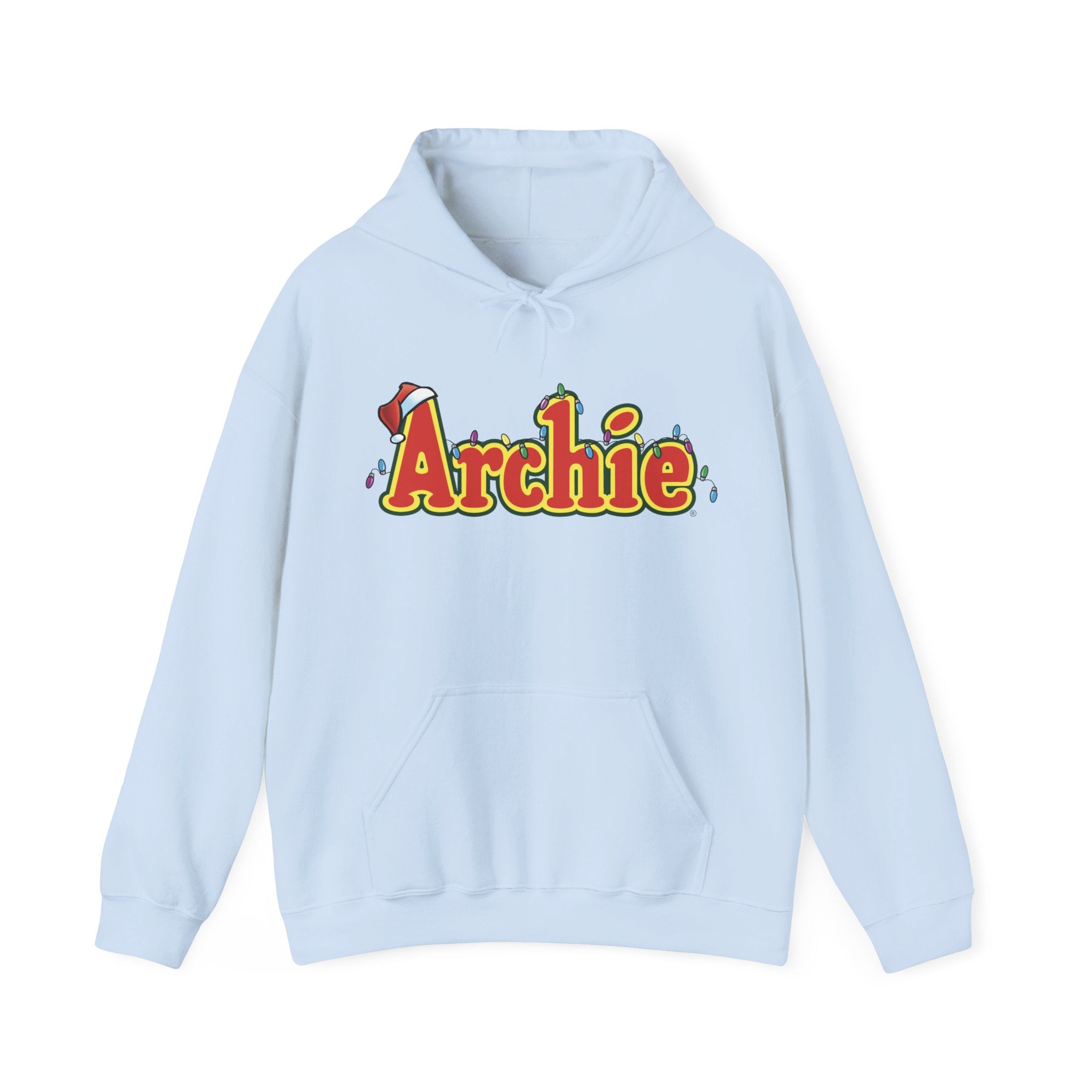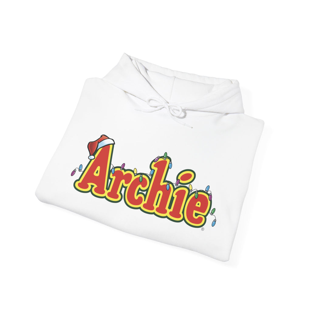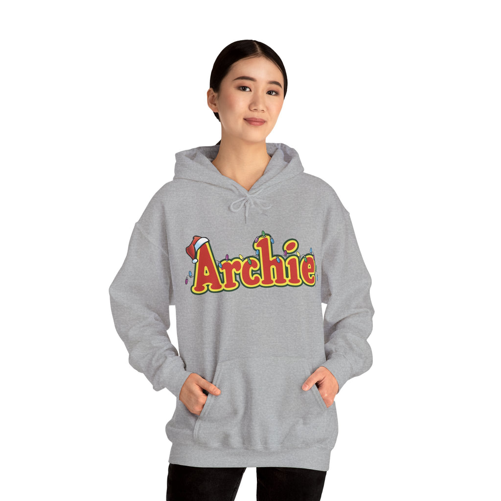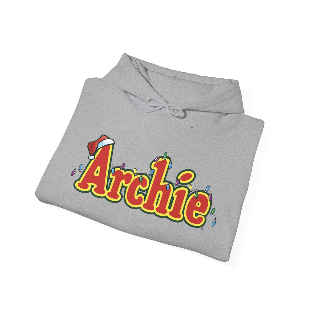 Archie Christmas Ornaments Design Unisex Heavy Blend™ Hooded Sweatshirt features printing on the front and back. On the front is the Archie Holiday Logo and the back is a collection of Archie Comics Ornaments.