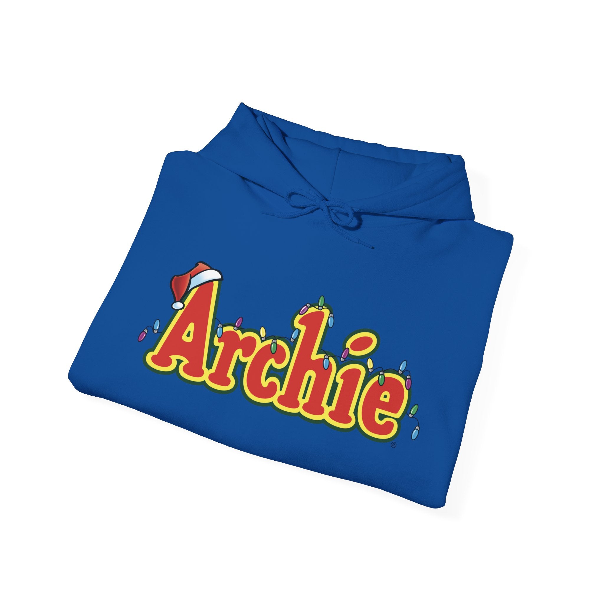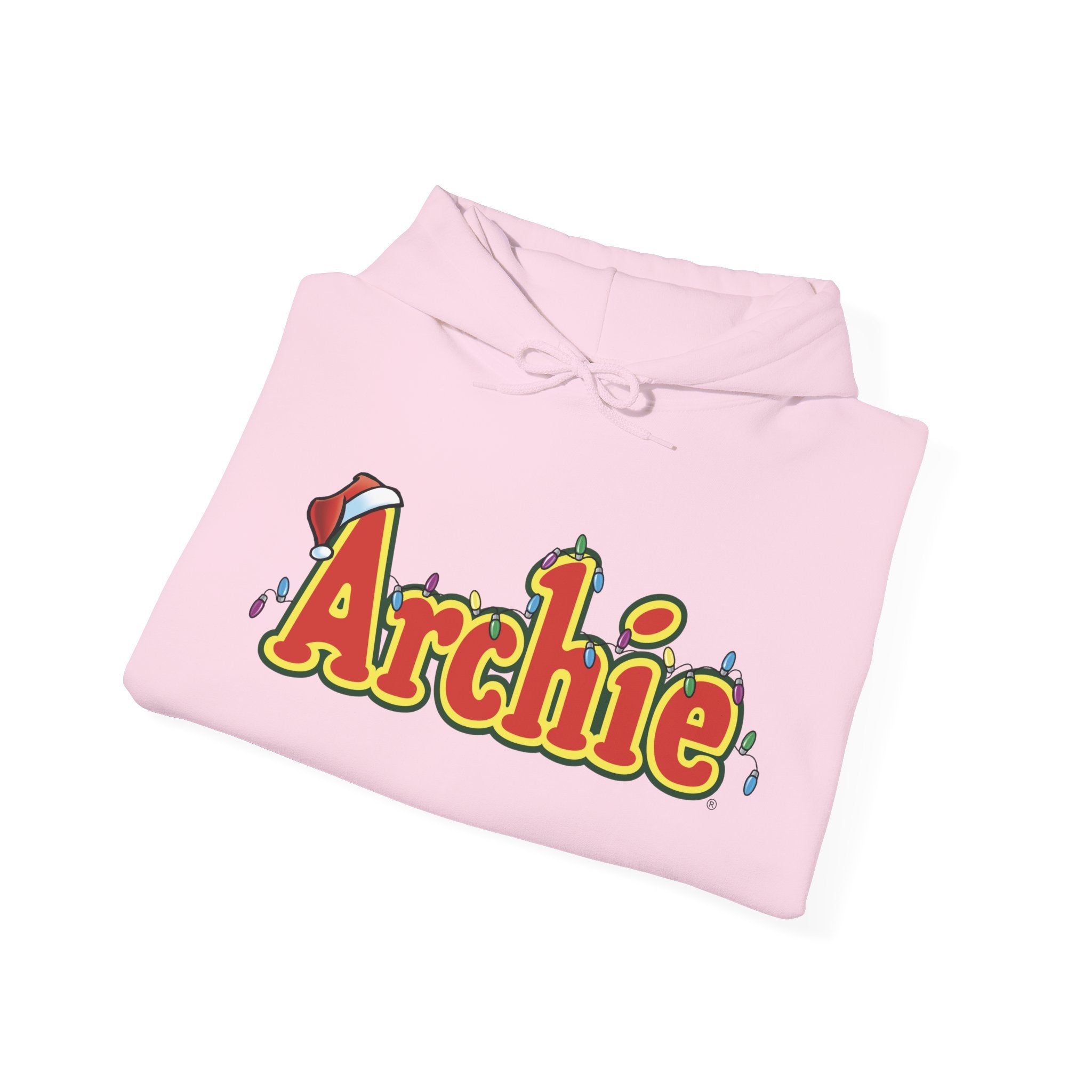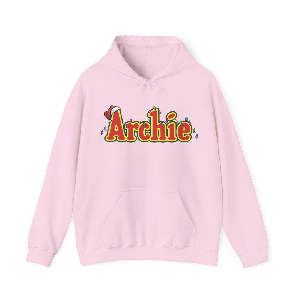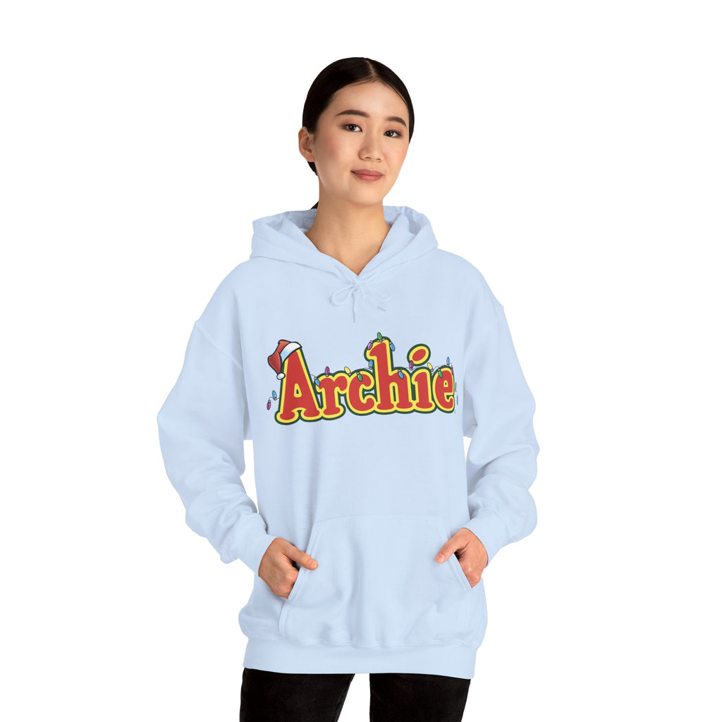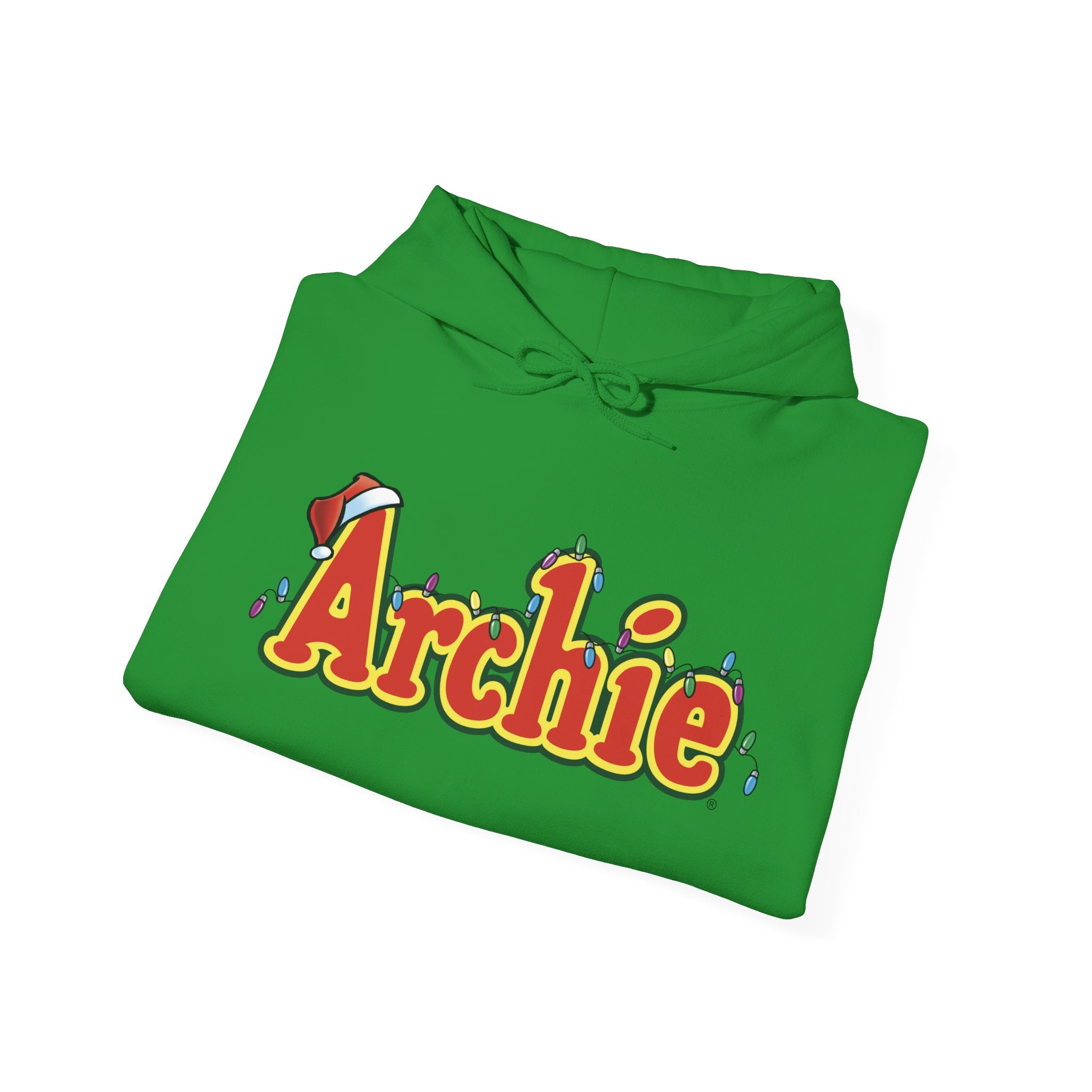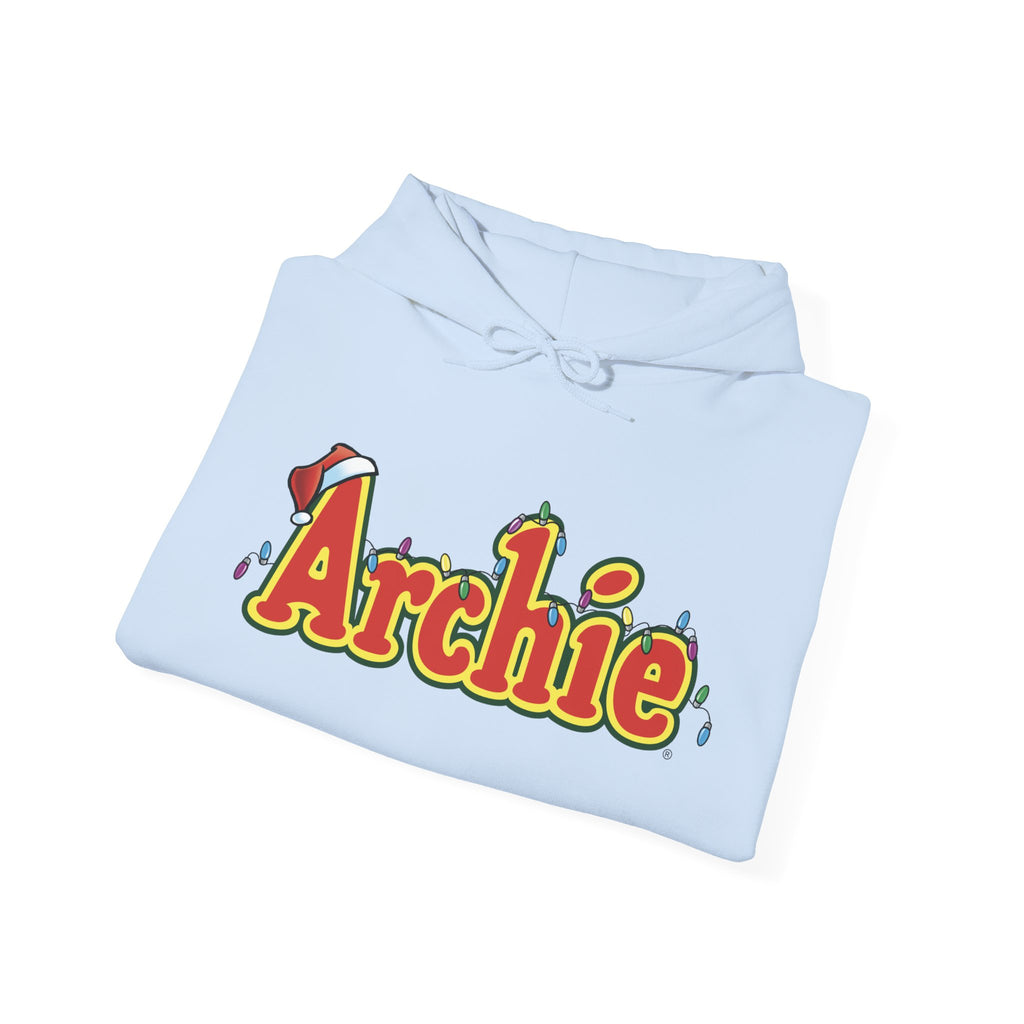 Archie Christmas Ornaments Design Unisex Heavy Blend™ Hooded Sweatshirt features printing on the front and back. On the front is the Archie Holiday Logo and the back is a collection of Archie Comics Ornaments.