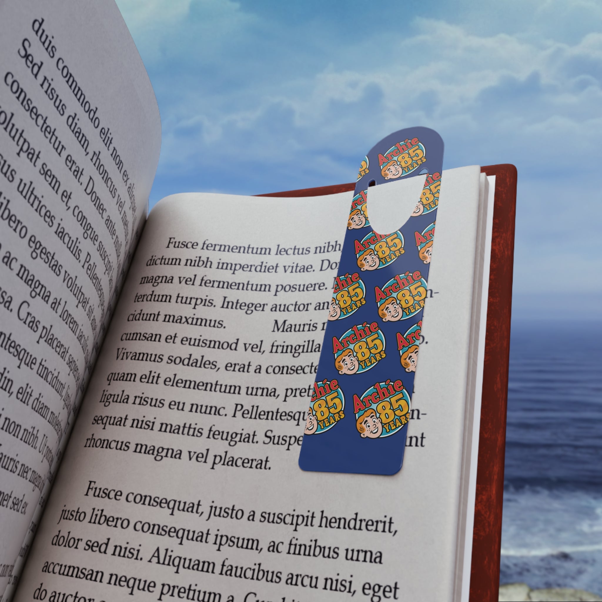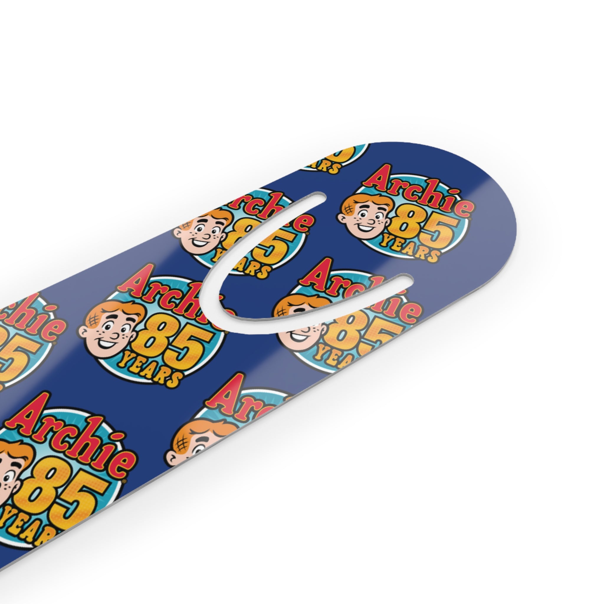 A slim, lightweight aluminum bookmark that slips easily into pages and stays put. The front showcases vibrant, full-color printing—featuring the Archie 85th Anniversary Logo—while the brushed aluminum back gives a subtle, tactile contrast. The rounded top and finger-friendly U-shaped slot make retrieving your place effortless. Whether tucked into a graphic novel (or a book with no pictures... boring) or slid inside a planner before a meeting, this bookmark feels thoughtful and made to last. Assembled in the USA from globally sourced parts, it blends everyday durability with bright, crisp color that keeps your page marked with personality.