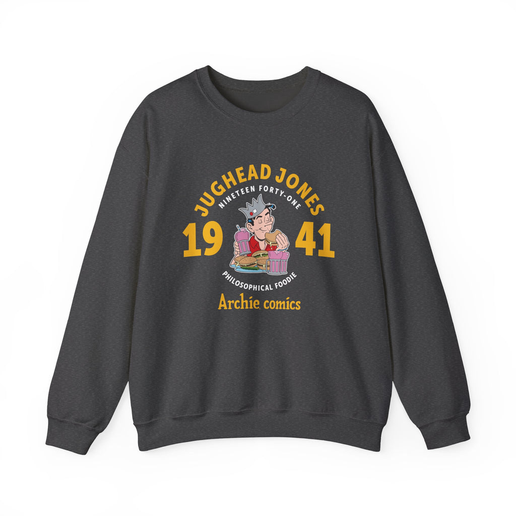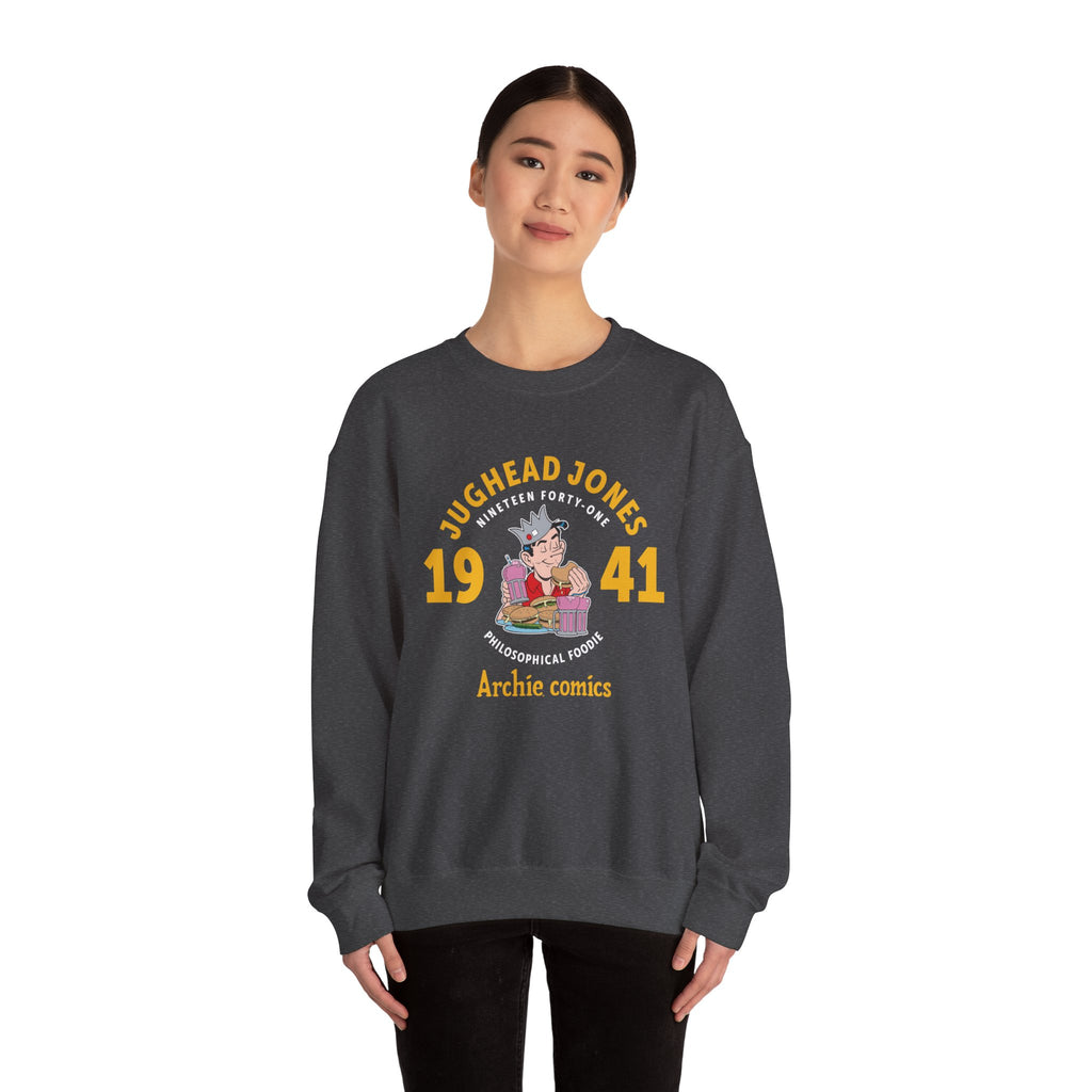 This sweatshirt showcases Jughead Jones in action, enjoying his favorite pastime — eating! Since 1941, Jughead has been delighting comic fans around the world with his quirky charm and insatiable appetite.